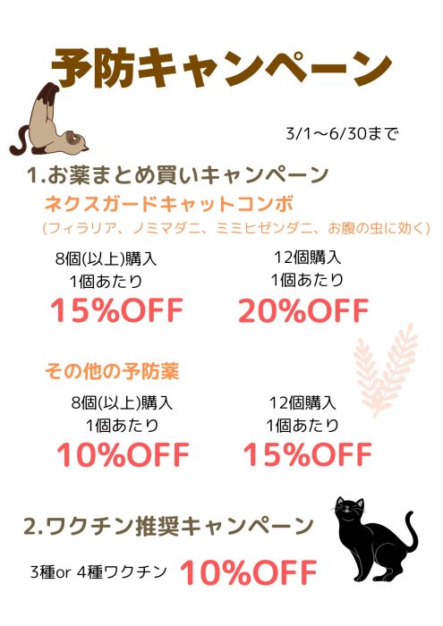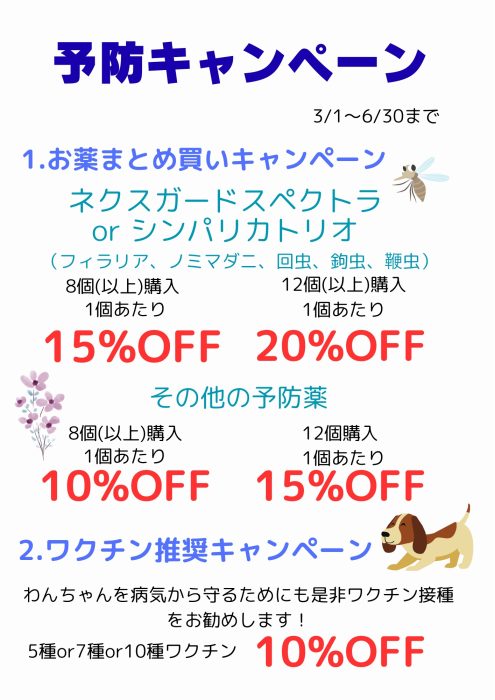 予防キャンペーンのお知らせ🌸🌸 2026.02.21 | お知らせ 3/1から6/30までワクチンと予防薬のまとめ買いを対象に行います‼︎詳細は画像をご覧ください(1枚目わんちゃん、2枚目ねこちゃんです)