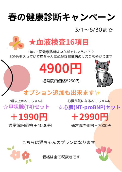 春の健康診断キャンペーンのお知らせ🌷🐝 2026.02.21 | お知らせ 3/1から6/30まで行います😲💡わんちゃん、ねこちゃんの健康診断をしてみませんか?詳細は画像をご覧ください(1枚目わんちゃん、2枚目ねこちゃんです)